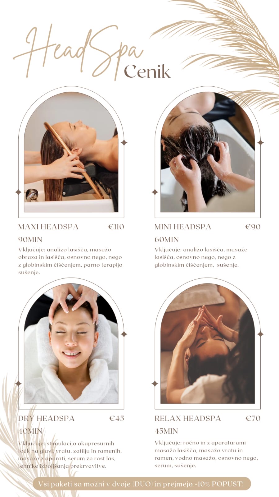45-minutni paket popolne sprostitve vključuje ročno in aparaturno masažo obraza in lasišča skozi celoten tretma, masažo vratu in ramen, vodno masažo, osnovno nego, masko ter sušenje las.